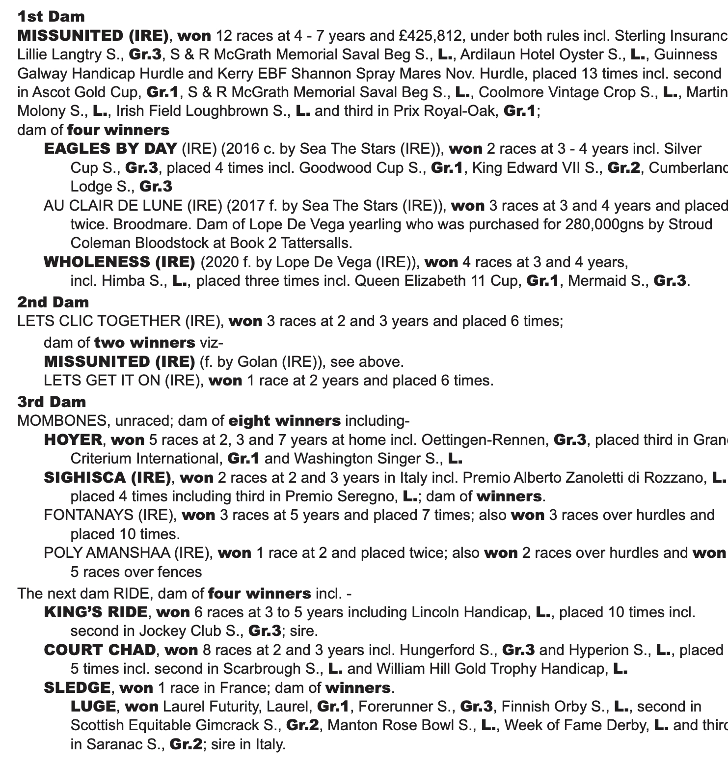 Dam MISSUNITED winner of 12 races under both codes inc. Gr.3 Lillie Langtry Stakes, Goodwood and Guinness Galway Handicap Hurdle, 2nd Gr.1 Gold Cup at Royal Ascot